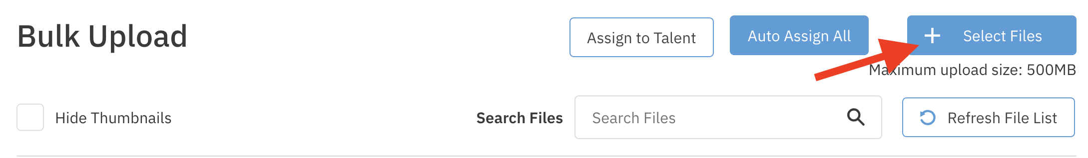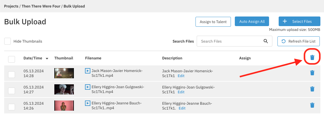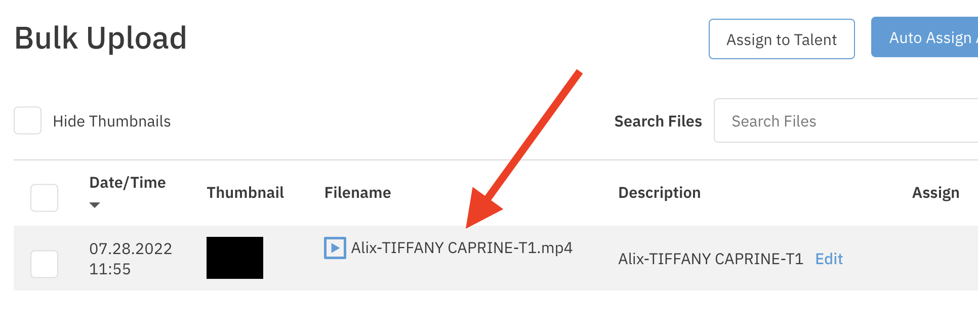 Before you select your files to upload, you will need to rename them to the correct format so that the auto-assign can register them correctly: "role name-talent name-take number" (ex. Hermione-Alix-T1).