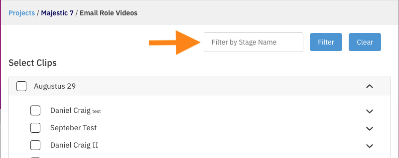 NEW - Users can now filter by "Stage Name" within the Email Project Video/Roles" page