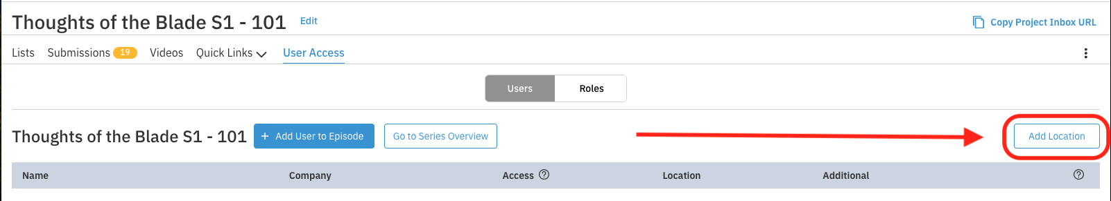 Once on the Project Access Page or Series Access Page you will see an Option to the far right either Add Location for a Single Project or Add Series Location for a Series.