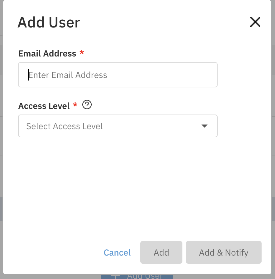 If a user account with that email already exists, simply choose the access level and select Add or Add & Notify*.