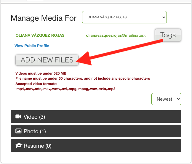 Follow these steps to add new photos, videos, or resumes to a talent's profile.