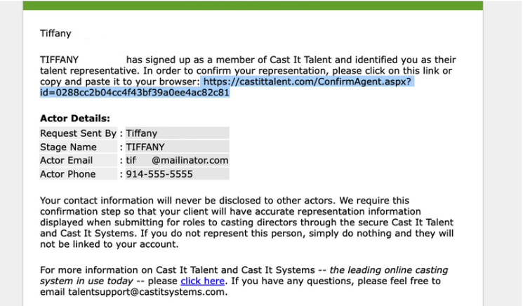When a talent adds you as their representative on their account, you will receive an automated notification email. Please ensure that the email address the talent entered matches the email address associated with your specific account.