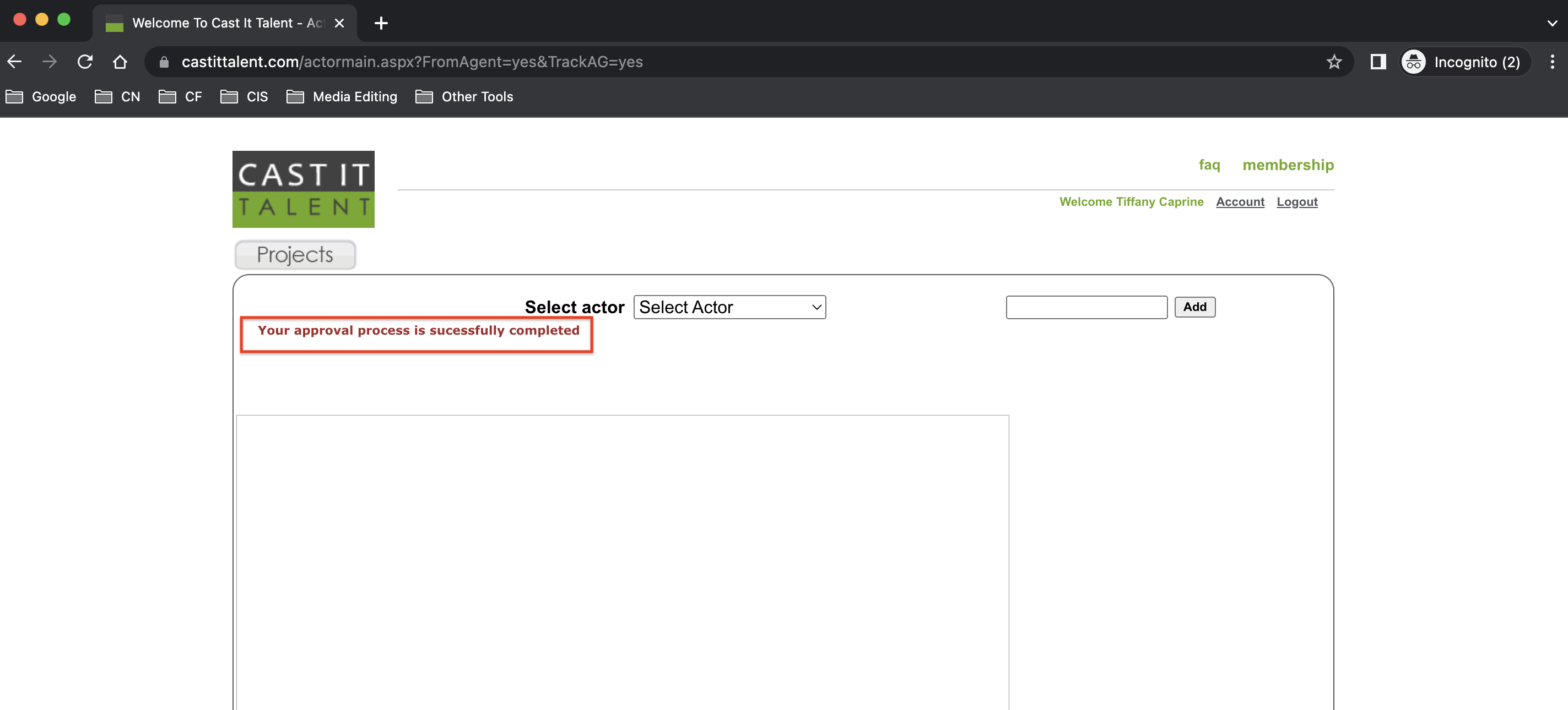Once you have clicked the link and seen this message, the talent's account is approved. You can now manage their profile and submit them for upcoming projects.