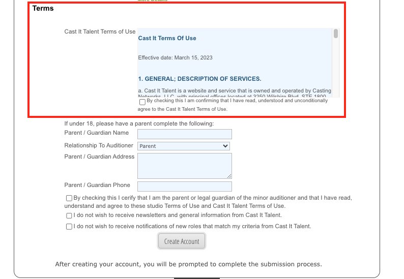 Note: For talent below 18 years old, a guardian must provide their email address and manage the account setup.Review and agree to our Terms and Conditions. Guardians are required to do this on behalf of underage talent. Click Create Account to continue the process of uploading your self-tape.