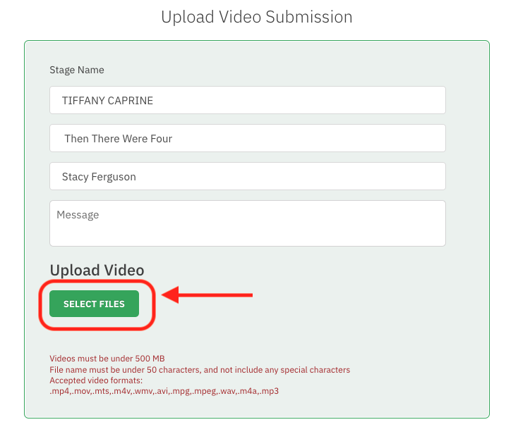 On the 'UPLOAD VIDEO SUBMISSION' page, select Select Videos from the "Upload Video" section to upload your audition material.