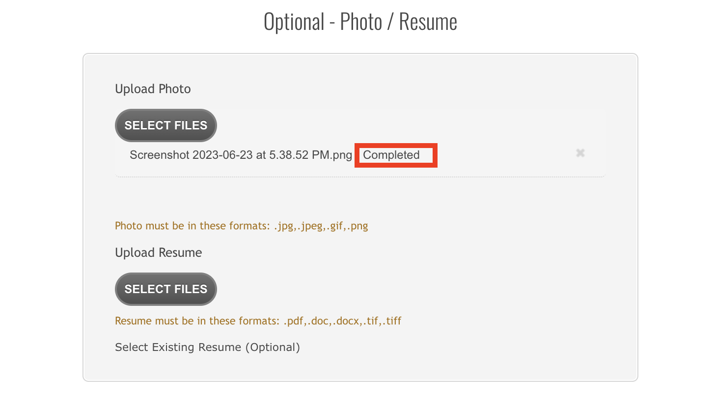 Similarly, upload your Photo and Resume under the relevant sections. Wait until the upload bar reflects the message Completed.