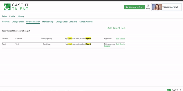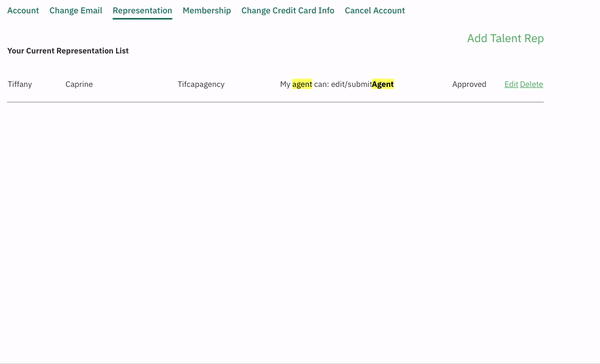 Your agent will receive an email to approve your request. If your representation has not approved your request, you can click resend to send your representation another email for approval. You can also Edit or Delete representation information at any time.